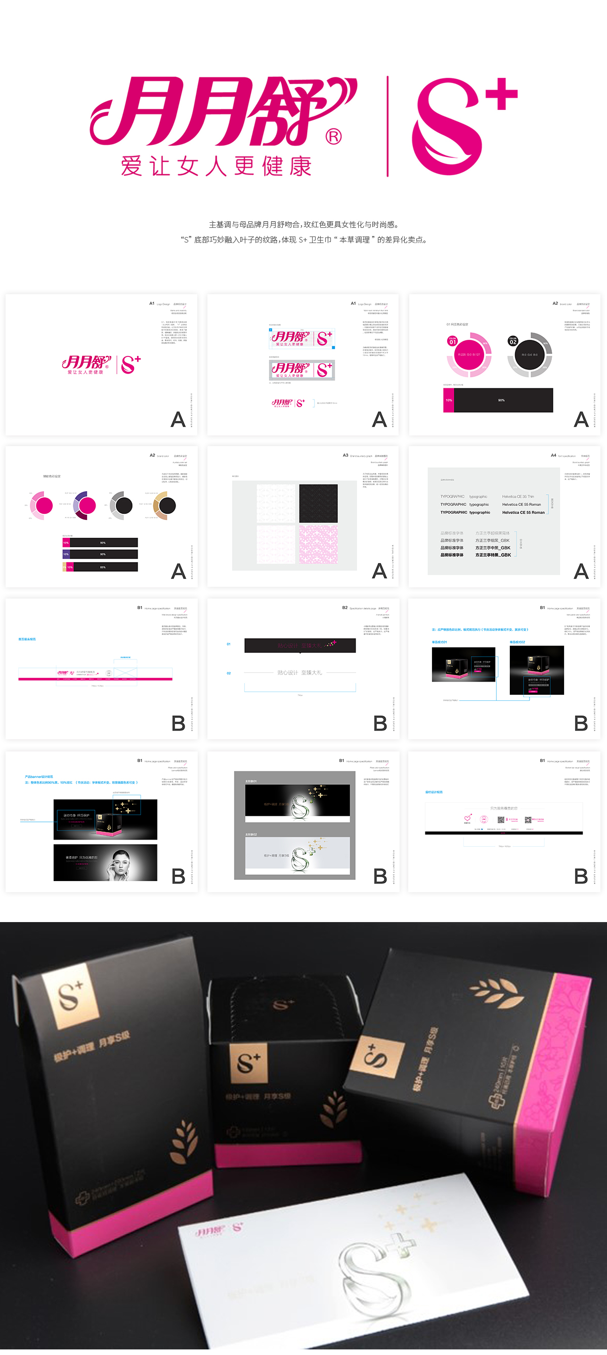 全新设计的品牌LOGO 主基调与母品牌月月舒吻合,玫红色更具女性化与时尚感。“S”底部巧妙融入叶子的纹路,体现S+卫生巾“本草调理”的差异化卖点。