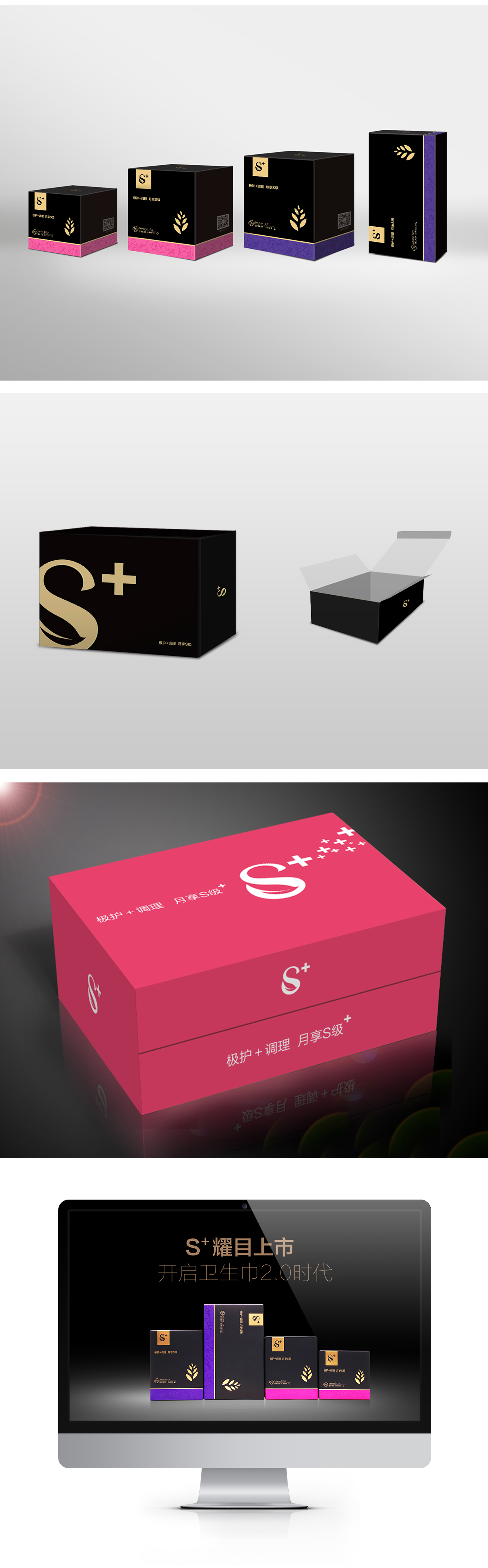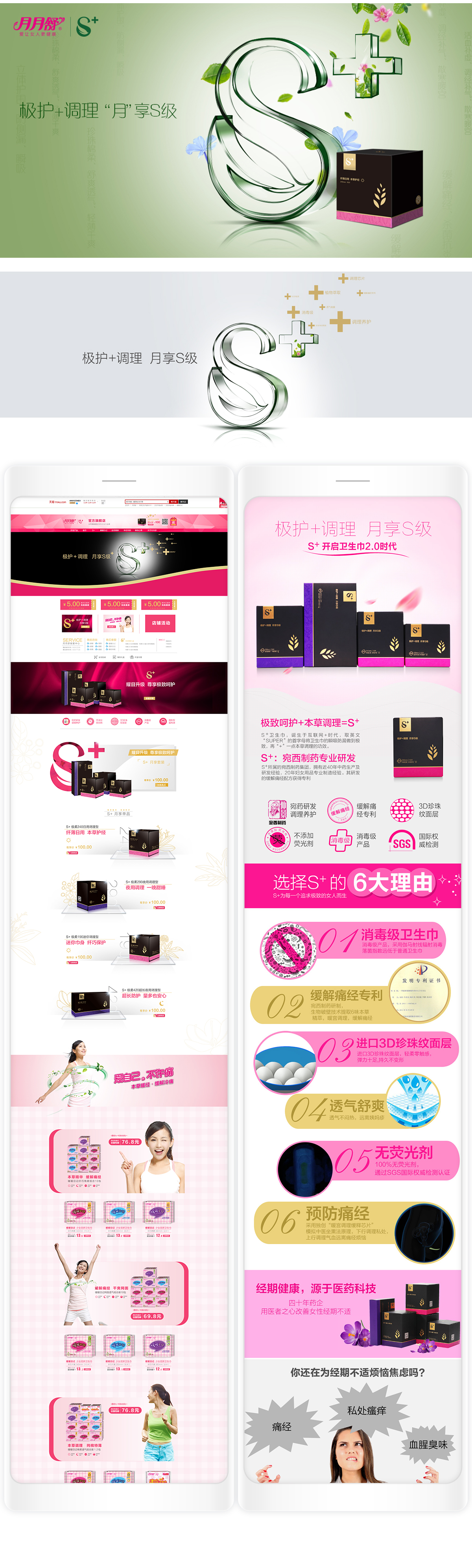 冠鹰电商定位策略:针对线上高端市场,结合月月舒医药背景背书,我们将产品定位于 “本草调理极护轻奢型卫生巾”品牌命名为极具互联网和时代感的名称“S+”,既融入极致(SUPER)的概念,又巧妙的将“+”植入其中, “+”号是医疗机构的典型标志,寓意S+卫生巾保健调理功能,同时也是表明“S+”是月月舒妇女用品旗下的顶级品牌。
