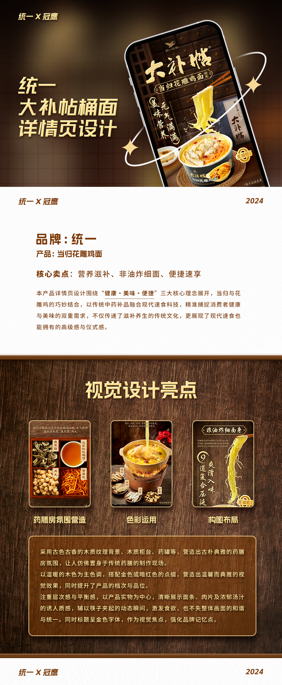 综上所述,统一大补贴当归花雕鸡面商品详情页通过精准的核心卖点提炼、独特的创意理念、专业的视觉设计以及创新的KV呈现,成功打造了一个既符合市场需求又具有品牌特色的商品展示空间。