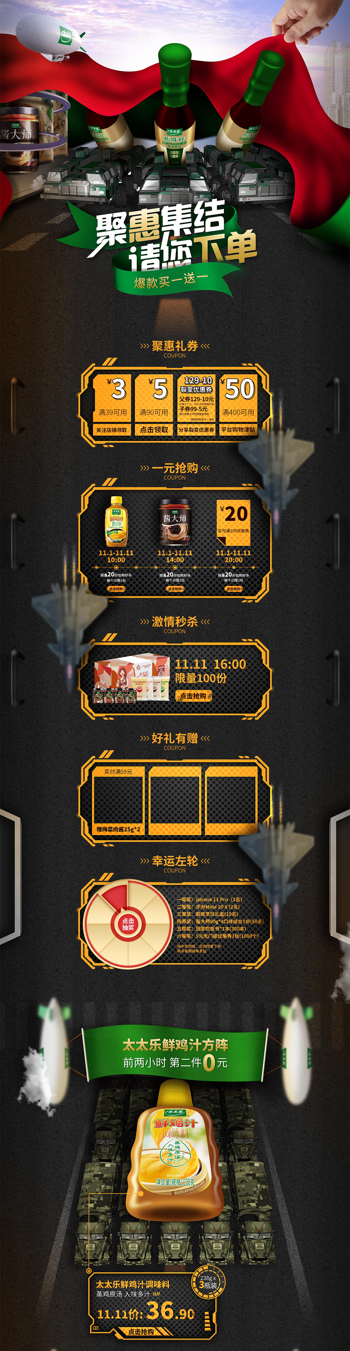 2019年双十一活动策划,趁着70周年国庆大阅兵的热度未减,我们给太太乐旗舰店双十一活动策划设计了一场聚惠大检阅