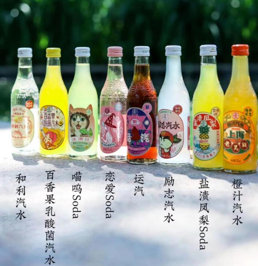国货复古风可以说是汉口二厂鲜明的标签,偏向将市场定位于95后、00。因此产品在包装上虽然复古,但是标签却非常的注重年轻化的表达,比如荔枝味的汽水,取名“励志”汽水。