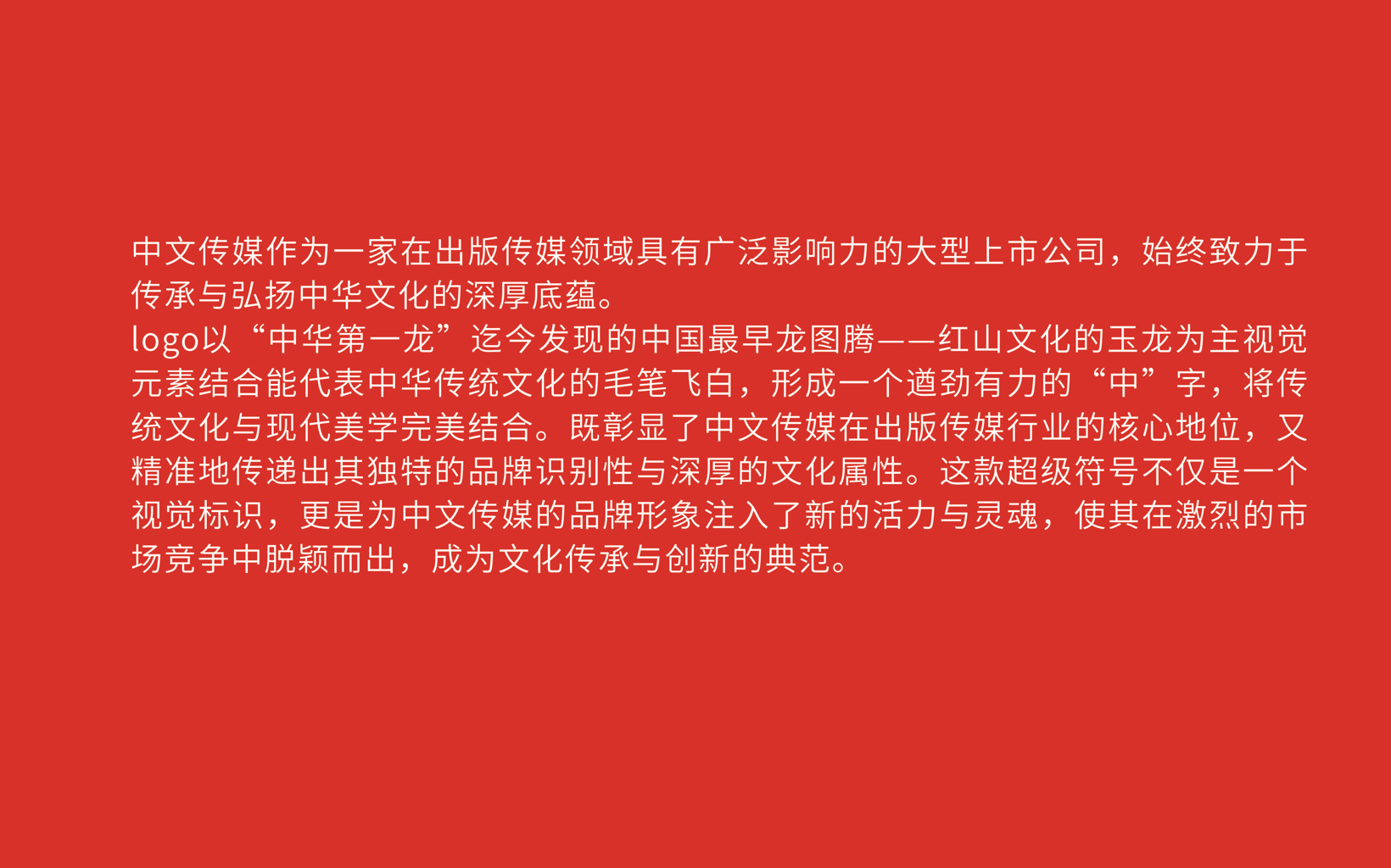 logo以“中华第一龙” 迄今发现的中国最早龙图腾——红山文化的玉龙为主视觉元素结合能代表中华传统文化的毛笔飞白,形成一个遒劲有力的“中”字,将传统文化与现代美学完美结合。既彰显了中文传媒在出版传媒行业的核心地位,又精准地传递出其独特的品牌识别性与深厚的文化属性。这款超级符号不仅是一个视觉标识,更是为中文传媒的品牌形象注入了新的活力与灵魂,使其在激烈的市场竞争中脱颖而出,成为文化传承与创新的典范。